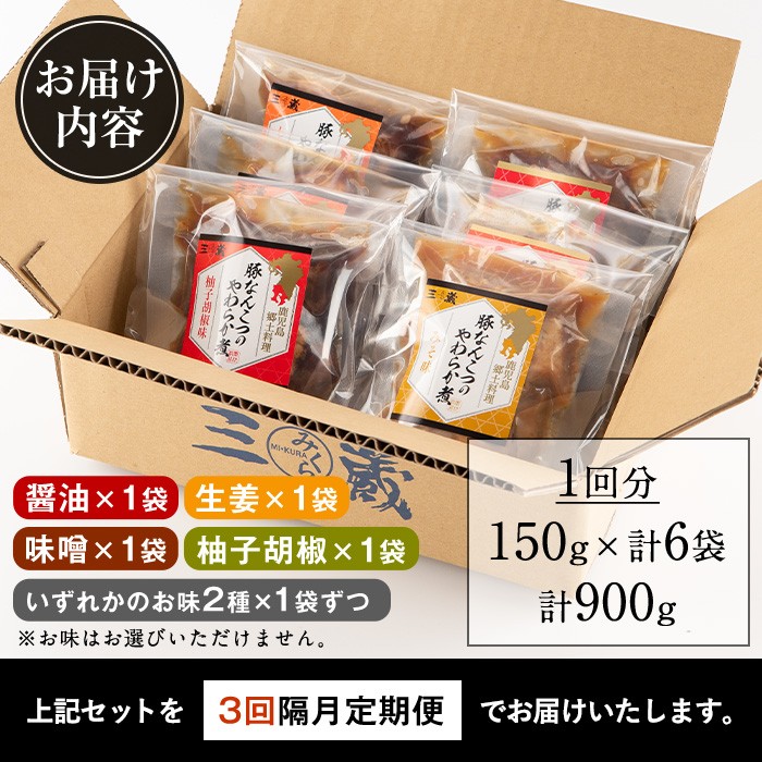 常温保存OK!4種類の味をお届け! i1197-A <定期便・計3回(隔月)>九州産豚なんこつのやわらか煮セット<(150g×6個・計900g)×全3回> 常温 常温保存 豚肉 軟骨 定期便 3回 醤油 生姜 柚子胡椒 味噌 おかず おつまみ お惣菜 セット 地元食材 コラーゲン レンチン 【西尾】