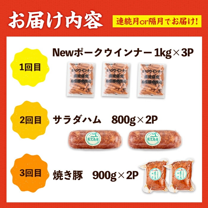 | 容量 | 【定期便】 1回目:Newポークウインナー(業務用) 1kg×3 2回目:サラダハム(業務用) 800g×2 3回目:焼き豚(業務用) 900g×2 |
