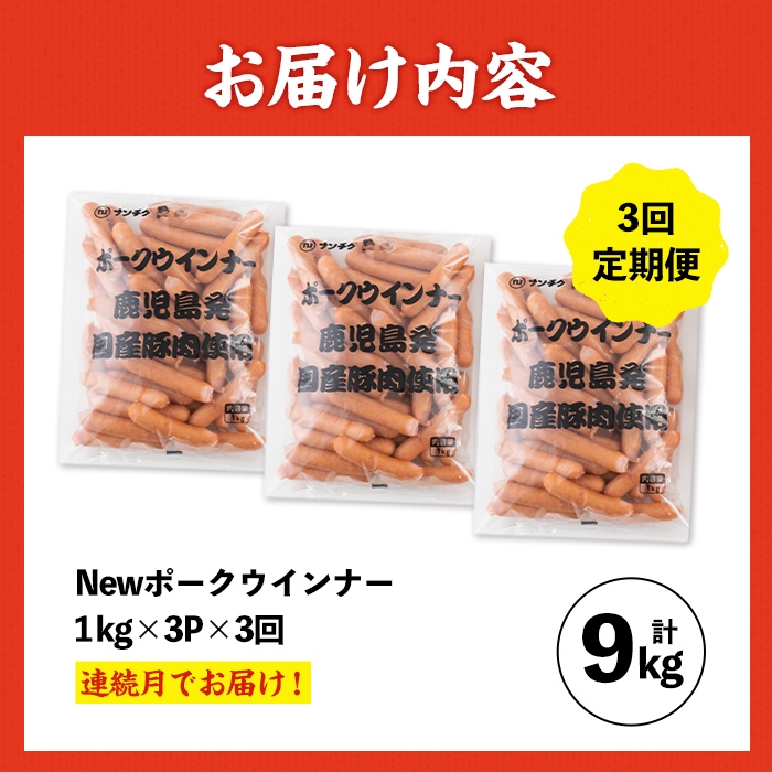| 容量 | 【定期便】 Newポークウインナー(業務用)1kg×3P×3回 ※定期便は連続月配送か隔月配送かお選びください。 |