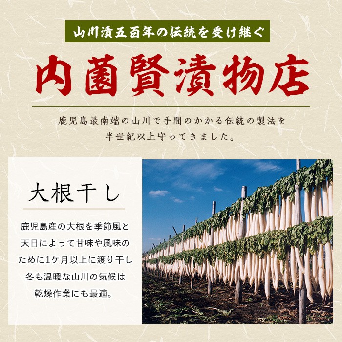 「山川漬」は、コリコリした歯ごたえでほのかな甘み、しっかり熟成された寒干し大根が味覚を刺激します。
