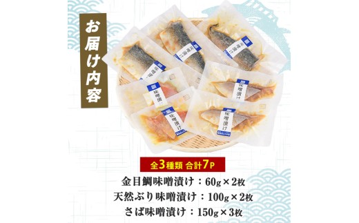 【金目鯛入り】漁師が厳選した素材を特製の味噌で漬け込みました。 【金目鯛入り】 漁師がつくる味噌漬け7Pセット(指宿山川水産/A-223) 鹿児島 金目鯛 キンメダイ 鰤 ブリ 鯖 サバ 魚 魚介 味噌漬け 味付き おつまみ 惣菜 おかず 弁当 小分け 冷凍 国産 簡単 調理済み 調理済 総菜 そうざい