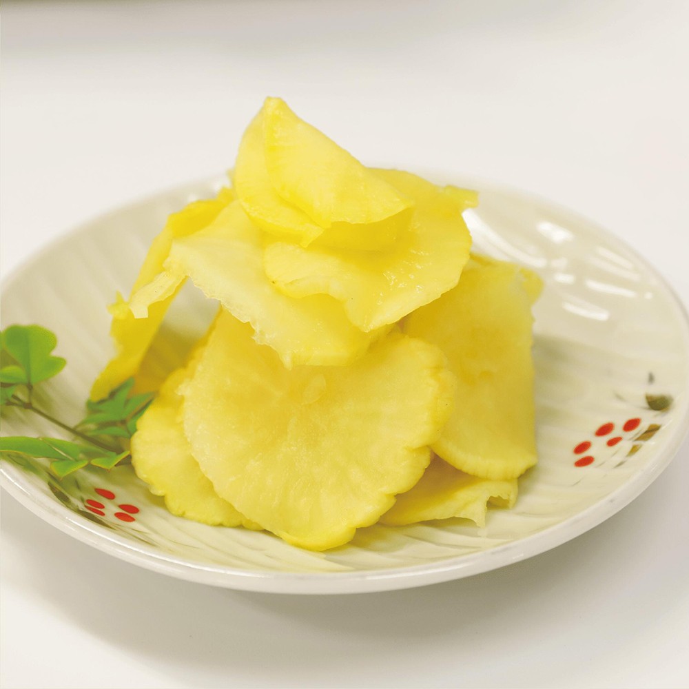 寒干し大根は鹿児島産を使用しており、酢、砂糖、みりん、塩、鷹の爪、焼酎で味付けし、独特な食感を楽しんでいただけるよう漬け込んであります。