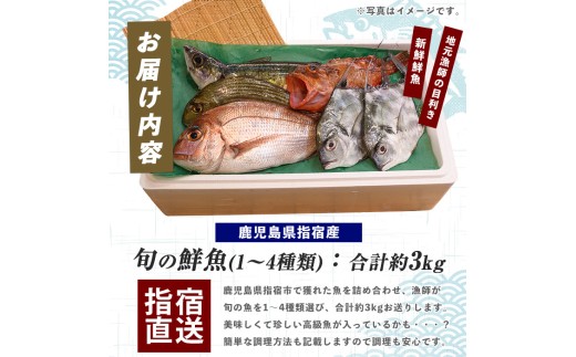 鹿児島県指宿市で獲れた魚を詰め合わせ、漁師が旬の魚を1~4種類選び、総重量3kg前後でお送りします。