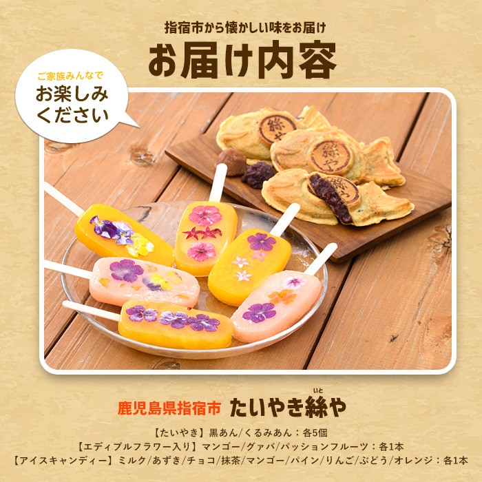 人気のたいやきと手作りアイスキャンディーのセット♪ 手作り たいやき 10個 手作り アイスキャンディーエディブルフラワー入り 計12本セット(たいやき絲や/016-1909) 鹿児島 アイス アイスキャンディー スイーツ おやつ ミルク あずき チョコ 抹茶 マンゴー パイン りんご ぶどう オレンジ 詰合せ 冷凍