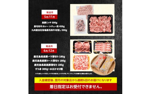 容量 | 1月/7月:4・5等級黒毛和牛ロースステーキ 2枚(400g)(水迫畜産) 2月/8月:黒毛和牛薄切りスライス 310g(水迫畜産)、黒豚生ハム 100g(水迫畜産)、マグロ丼 100g×3P(山川町漁協)、本枯粉 50g(カネニニシ) 3月/9月:4・5等級黒毛和牛ミックス焼肉 300g(水迫畜産)、カツオ丼 100g×3P(山川町漁協) 4月/10月:黒豚薄切りしゃぶしゃぶ 180g(水迫畜産)、黒豚バラしゃぶしゃぶ 180g(水迫畜産)、黒豚生ハム 100g(水迫畜産)、カツオのたたき炭火焼 約200g(指宿食品)、鰹本枯粉 50g(カネニニシ) 5月/11月:黒豚ミンチ 500g(水迫畜産)、黒毛和牛カレー・シチュー用 450g(水迫畜産)、九州産自社牧場黒毛和牛切落し 500g(水迫畜産) 6月/12月:鹿児島県産豚バラ薄切り 180g(水迫畜産)、鹿児島県産豚ロース薄切り 180g(水迫畜産)、鹿児島県産黒豚薄切り 180g(水迫畜産)、すり身 300g×おまかせ2種(山川町漁協) ※すり身は、シイラ甘口、シイラ甘さ控えめ、シイラうす味、アジ、イワシ、ブリの6種うち2種をお届けします。 |