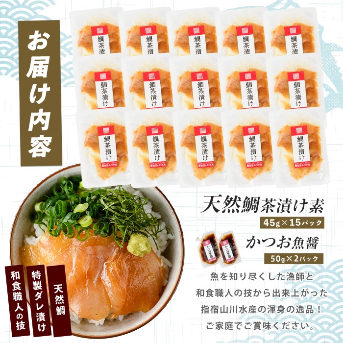 気軽に上質茶漬け!職人たちによって作られたこだわりの逸品 【国産天然鯛】漁師が作った天然鯛茶漬け15Pかつお魚醤付 (指宿山川水産/IB035-010) 鹿児島 天然鯛 天然 魚醤 海鮮 海産物 魚介 魚 茶漬け お茶漬け 和食 小分け 個包装 パック セット 冷凍 国産 ギフト 手軽 簡単
