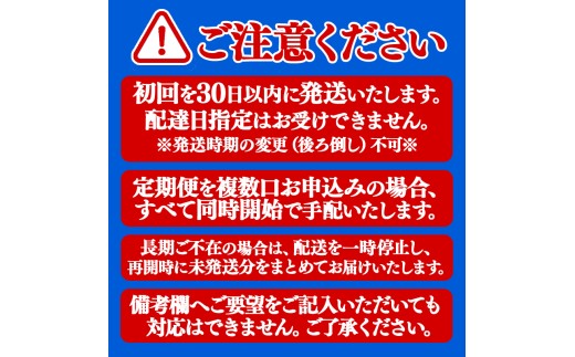 【定期便について】 入金確認後30日以内に初回発送いたします。 ※定期便を複数口お申込みの場合、すべて同時にお届け開始でのお手配となります。 ※お届け日時の指定は承れません(備考欄にご記入いただいても対応いたしかねます)。 ※長期不在の場合は定期配送を一時停止し、再開時に未出荷分をまとめてお届けいたします。 ※沖縄県・離島への配送はいたしかねます。ご了承ください。 |