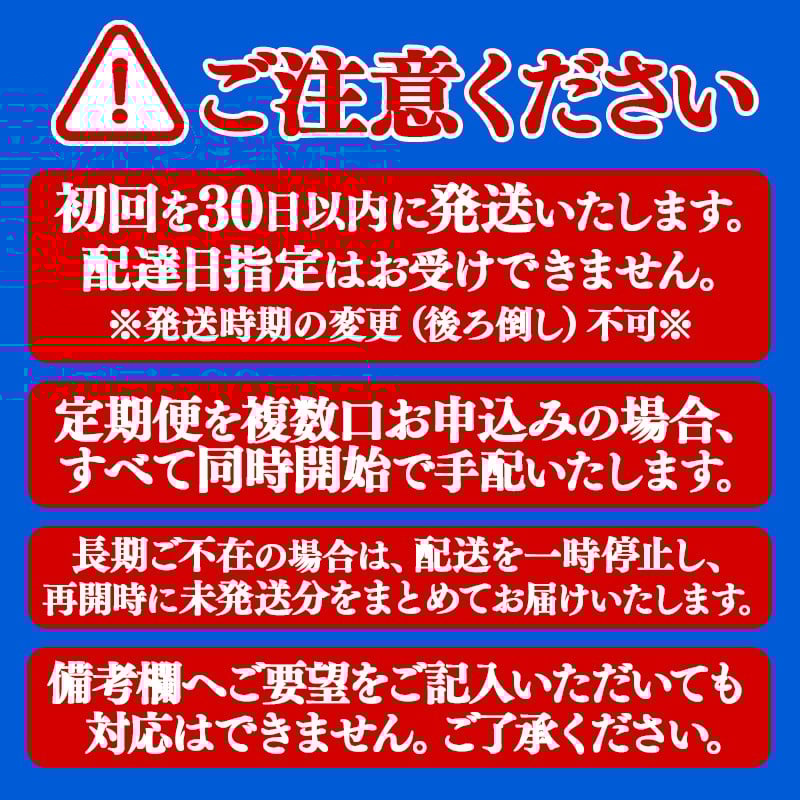 【定期便について】 入金確認後30日以内に初回発送いたします。 ※定期便を複数口お申込みの場合、すべて同時にお届け開始でのお手配となります。 ※お届け日時の指定は承れません(備考欄にご記入いただいても対応いたしかねます)。 ※長期不在の場合は定期配送を一時停止し、再開時に未出荷分をまとめてお届けいたします。 ※沖縄県・離島への配送はいたしかねます。ご了承ください。 |