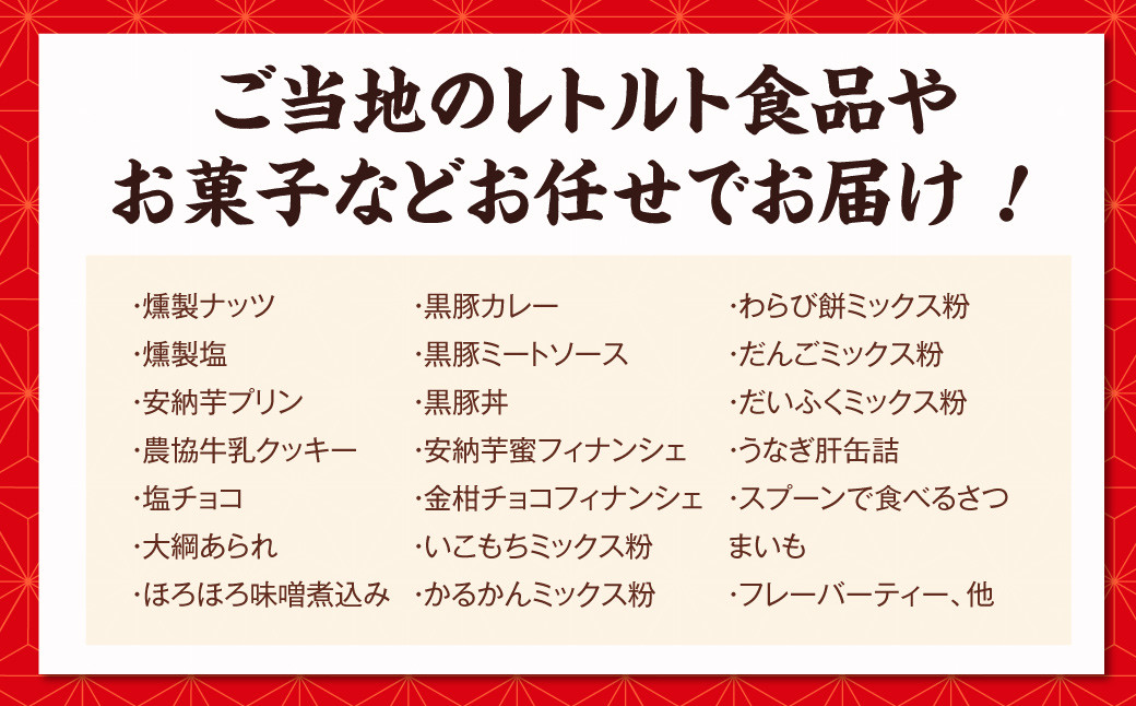 【燻製ナッツ】アーモンド(米国産)、くるみ(米国産)、カシューナッツ(インド産)植物油脂、食塩(鹿児島県産)【燻製塩(桜・檜・ヒッコリー)】海水(鹿児島県産)【安納芋プリン】牛乳(鹿児島県産)、砂糖、脱脂粉乳、サツマイモペースト、寒天、塩/ゲル化剤(加工でん粉、増粘多糖類)、乳化剤、香料(一部に乳成分を含む)【農協牛乳クッキー】小麦粉(国内製造)、牛乳、マーガリン、砂糖、加糖卵黄、脱脂粉乳/香料(一部に小麦・卵・乳成分を含む)【塩チョコ】カカオマス(国内製造)、砂糖、ココアバター、コーンフレーク、食塩(鹿児島県産)、乳糖/乳化剤、香料(一部に乳成分・大豆を含む)【味噌煮込み】黒豚(鹿児島県産)、麦味噌、酒精、ぶどう糖果糖液糖、砂糖、醤油、米発酵調味料、魚介エキス、味醂、醸造酢、生姜/調味料(アミノ酸等)、甘味料(甘草)、粘着剤(増粘多糖類)、カラメル色素、紅麴色素(一部に小麦・サバ・大豆・りんごを含む)【黒豚カレー】黒豚(鹿児島県産)、小麦粉、加工油脂、ぶどう糖、食塩、カレー粉、コーンスターチ、砂糖、粉末水あめ、たまねぎ、大豆油、牛脂、香辛料/調味料(アミノ酸等)、カラメル色素(一部に小麦・大豆・豚肉・牛肉を含む)黒豚ミートソース】黒豚(鹿児島県産)、トマトピューレ、ソテードオニオン、植物油、フライドガーリック、塩/酸化防止剤(V,E)、(一部に豚肉・大豆を含む)【黒豚丼】黒豚肉(鹿児島県産)、玉葱、丼タレ(醤油、砂糖、ぶどう糖果糖液糖、うなぎエキス、みりん、かつおエキス、酵母エキス、かきエキス、魚醤)、おろし生姜/加工デンプン、調味料(アミノ酸)、カラメル色素、増粘剤(キサンタン)、ソルトビトール、(一部に豚肉・小麦・さば・大豆を含む)【安納芋蜜フィナンシェ】卵白(国産)、砂糖、小麦粉、アーモンドパウダー、マーガリン、さつまいも加工品(安納芋蜜)、さつまいもペースト、塩、小麦たんぱく加水分解物/pH調整剤、香料、(一部に卵・小麦・乳成分を含む)