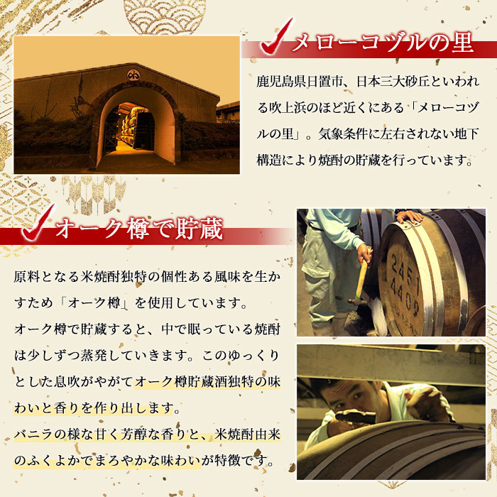 「メローコヅル」は、原料となる米焼酎独特の個性ある風味を生かすため「オーク樽」を使用しています。