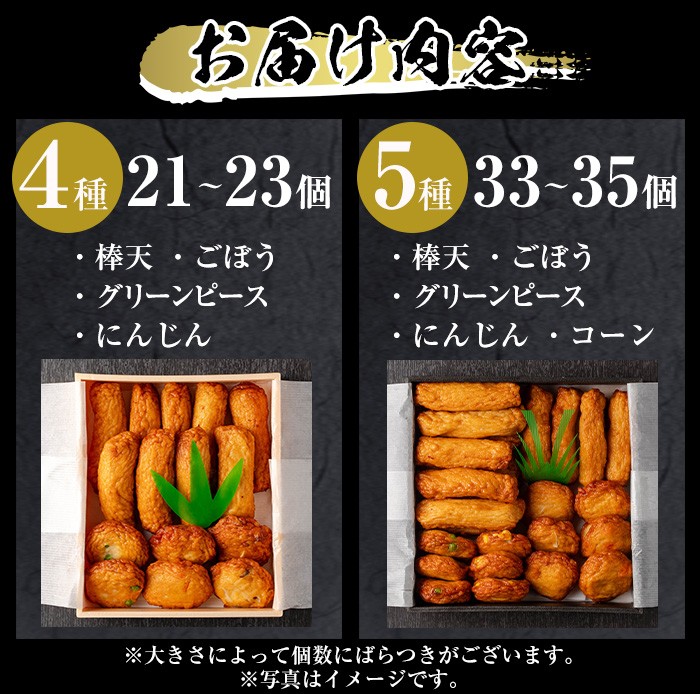 | 容量 | 【4種】21〜23個 ・棒天 ・グリーンピース ・ごぼう ・にんじん 【5種】33〜35個 ・棒天 ・グリーンピース ・ごぼう ・にんじん ・コーン ※大きさによって個数にばらつきがございます。 ※要冷蔵10℃以下保管 ※到着後、冷蔵庫にお入れ下さい。 |