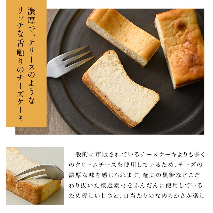 pâtissierの出身地である「奄美大島産の黒糖」と「日置市のオリーブオイル」を使用し、濃厚さとテリーヌのようなリッチな舌触りに拘り抜いたチーズケーキ。