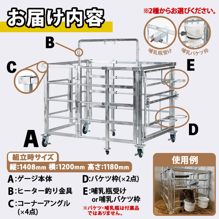| 容量 | ・ゲージ本体(キャスター付き) ・ヒーター釣り金具 ・コーナーアングル×4点 ・バケツ枠×2点 ・哺乳瓶受けor哺乳バケツ枠 ※哺乳瓶受けと哺乳バケツ枠はどちらかお選びいただけます。 ※ヒーター・哺乳瓶・哺乳バケツは含まれておりません。 【サイズ(組立時)】 1408mm×1200mm×1180mm(縦×横×高さ) 【サイズ(組立時・枠取付時)】 1408mm×1200mm×1420mm(縦×横×高さ) 【サイズ(収納時)】 239mm×1180mm×1110mm(縦×横×高さ) 【重量】 約90kg |