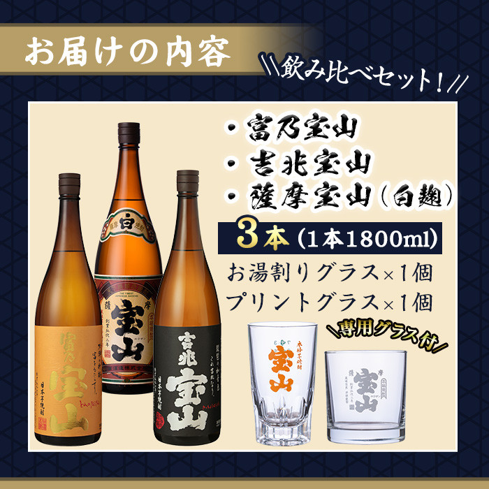 西酒造、小正醸造、南国酒造の人気商品の飲み比べセット! No.989 <数量限定>芋焼酎飲み比べ3本セット「富乃宝山」「吉兆宝山」「薩摩宝山」(1800ml×3本)専用グラス付き!酒 芋 焼酎 米麹 さつま芋 国産米 アルコール 飲み比べ セット【宮下酒店】