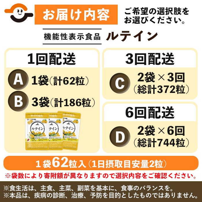 目の健康が気になる方に!体内で作ることのできないルテインを補うことができる! No.900/1033/1283/1291 <選べる>ルテイン(1袋 62粒入り/1袋・3袋・2袋×3回・2袋×6回) 鹿児島 日置市 健康食品 機能性表示食品 加工食品 サプリ サプリメント 栄養バランス 食生活 安心安全 目 ブルーライト 保護 頒布会 配送回数 選べる【てまひま堂】