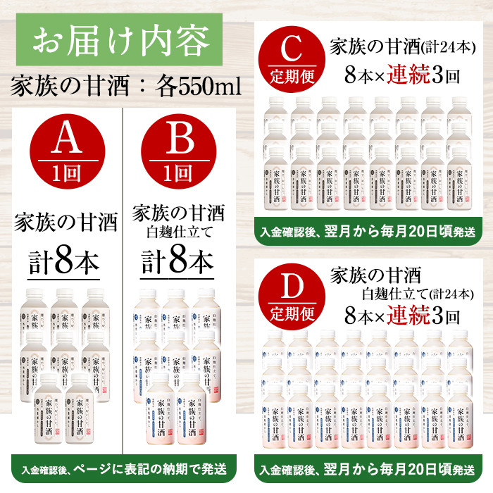 | 容量 | A.【1回】家族の甘酒:550g×8本 B.【1回】家族の甘酒 白麹仕立て:550g×8本 C.【定期便】家族の甘酒:550g×8本×3回 計24本 D.【定期便】家族の甘酒 白麹仕立て:550g×8本×3回 計24本 上記から1種お選びください。 ※選択肢により寄附額が異なりますのでご注意ください。 |