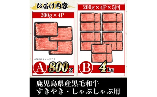 容量 | 鹿児島県産黒毛和牛すきやき・しゃぶしゃぶ用 A.計800g(200g×4P) B.計4kg(200g×4P×5回) どちらかお選びください。 |