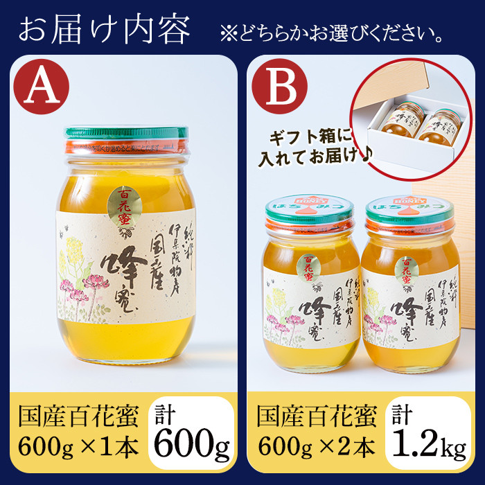 | 容量 | 国産百花蜜 A,600g×1本 B,600g×2本 どちらかお選びください。 ※選択肢により寄附額が異なりますのでご注意ください。 ※蜂蜜は品質上寒い時に白く結晶することがあります。キャップをゆるめ、ぬるま湯から徐々に温めて湯煎してください。湯煎の温度が50度以上にならないように気をつけてください。 |