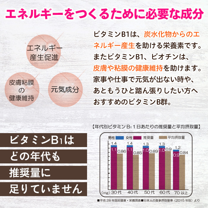 日々の家事や仕事で元気が出ない時はもちろん、あともう少し踏ん張りたい時の【緑の下の力持ち】として、ビタミンB群に含まれる元気成分ビタミンB1がお手伝いします。