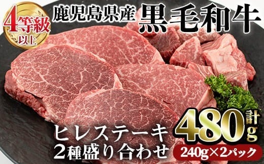 鹿児島県産黒毛和牛(4~5等級)ヒレステーキ2種盛り(合計480g・2…