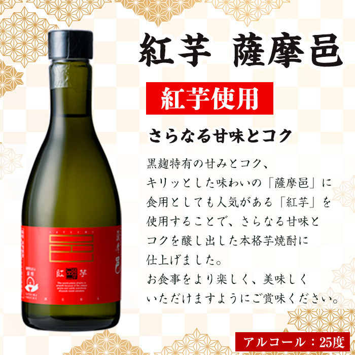 ※20歳未満の者の飲酒は法律で禁止されています。 老若男女問わず人気の高い黒麹仕込みの薩摩邑、スッキリとした喉越しで特に食事との相性は抜群! 紅芋仕込みの薩摩邑は甘みの強い紅芋を使用し、芋本来の甘みを存分に楽しめる女性ファンも多い焼酎! それぞれ人気の高い芋焼酎を存分に楽しめるセットです。 出荷元 : 岩川醸造株式会社 曽於市 特産品 焼酎 芋焼酎 本格芋焼酎 芋 紅芋 麹 黒麹 酒 お酒 アルコール 飲み比べ セット 詰め合わせ 常温 常温保存