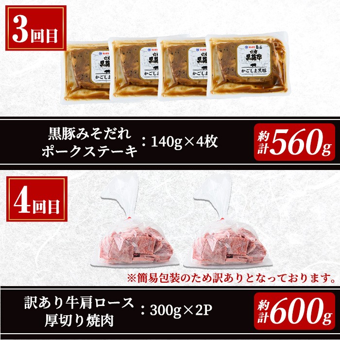 | 容量 | 【1回目】 九州産豚ロース生姜焼き:計600g(200g×3P) 【2回目】 鹿児島県産黒毛和牛モモスライス:500g 【3回目】 黒豚みそだれポークステーキ:計560(140g×4枚) 【4回目】 訳あり牛肩ロース厚切り焼肉:計600g(300g×2P) 【5回目】 ・鹿児島県産黒毛和牛ロースステーキ:計400g(200g×2枚) ・ゆずこしょう:1個 |