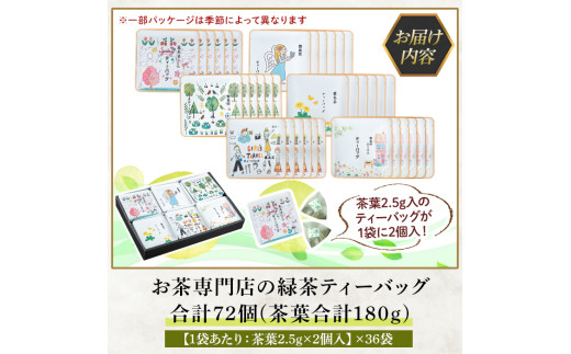 甘い香りと旨味、きれいな緑色の水色(すいしょく)が特徴の、お茶専門店ティーバッグを36袋。1袋2.5g入の2個入りで、合計72個になります。6種類の柄が6袋ずつ、お好きな柄で、その日の気分に合わせてお選びいただけます。季節によって柄の変わるものがあります。