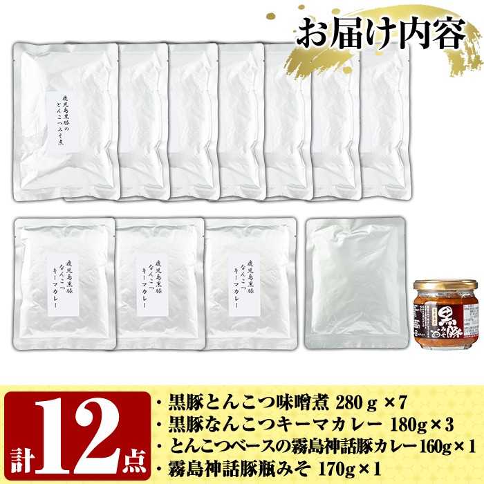 通常品のとんこつみそ煮とキーマカレー・とんこつベースのカレーのセットに豚みそ付き C0-090 鹿児島県産黒豚特産品の詰合せ(4種計12個)【富士食品】霧島市 豚肉 惣菜 レトルト食品 レトルト おかず 小分け 郷土料理 豚骨味噌煮 トンコツ カレー レトルトカレー キーマカレー ポークカレー 常温 温めるだけ