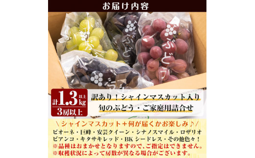 地域の生産者応援の品 栽培期間中、化学肥料・除草剤不使用!霧島の大地で育った自然な美味しさのブドウ♪ A0-248 <期間限定!2025年8月下旬~10月末までの間に発送予定>《訳あり・数量限定》シャインマスカット入り旬のぶどう・ご家庭用詰め合わせ(計1.3kg以上・3房以上)【二月田ぶどう園】