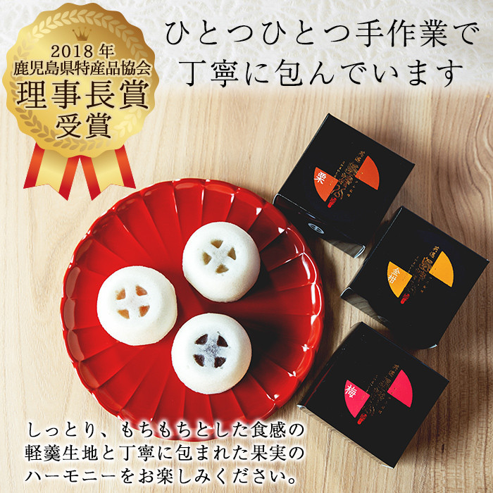 鹿児島の伝統的な和菓子かるかん饅頭に果実を手作業で丸ごと包んだ独自の軽羹! A6-003 かるかん饅頭「英邁 島津公」3種セット(計9個)【森三】霧島市 和菓子 かるかん 軽羹 饅頭 まんじゅう 茶請け 常温