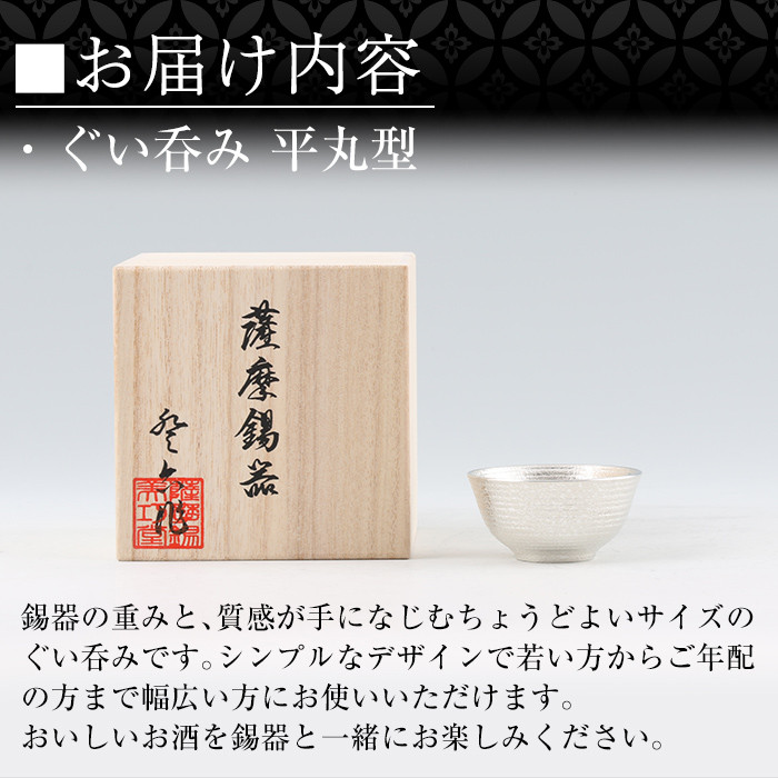 《皇室献上実績》焼酎の味がまろやかになると言われている伝統工芸品、薩摩錫器の酒器 B0-190 薩摩錫器 ぐい呑み平丸型【薩摩錫器工芸館】 霧島市 鹿児島 伝統工芸品 錫製品 錫製 ぐい呑み 錫 酒器 食器 日用品 ギフト 贈答 贈り物 プレゼント