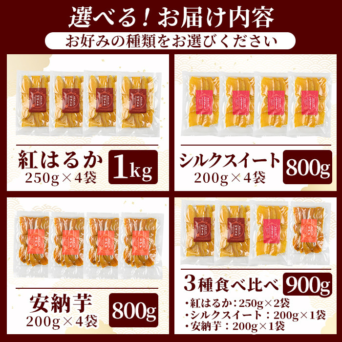 鹿児島の自然豊かな大地で育ったさつまいもで作った完熟干し芋です! K-193 選べる!完熟干し芋 合計800g~1kg(紅はるか・シルクスイート・安納芋・3種食べ比べセット)【フレッシュジャパン鹿児島】国産 霧島市 鹿児島県産 熟成 ほしいも 干しいも 干し芋 芋 いも さつまいも さつま芋 サツマイモ 熟成 スイーツ おやつ 常温