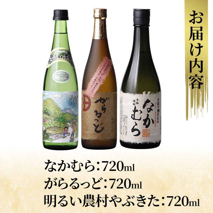 鹿児島本格芋焼酎3種飲み比べセット!各720ml! K-236 本格芋焼酎飲み比べセット!「なかむら」「がらるっど」「明るい農村やぶきた」(各720ml)【石野商店】 焼酎 芋焼酎 本格芋焼酎 本格焼酎 酒 宅飲み 家飲み 詰合せ 詰め合わせ