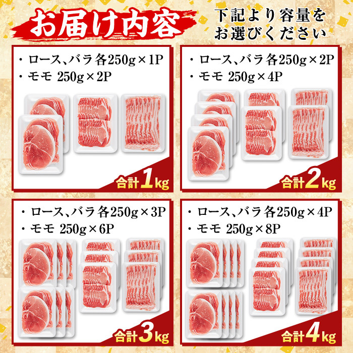 鹿児島県産薩摩トロ豚の3つの部位が楽しめるセット! K-470 <選べる容量>鹿児島県産 薩摩トロ豚しゃぶしゃぶ3種盛り(計1kg~4kg)【ふるさと産直バザール】霧島市 ロース バラ モモ 国産 鹿児島県産 肉 精肉