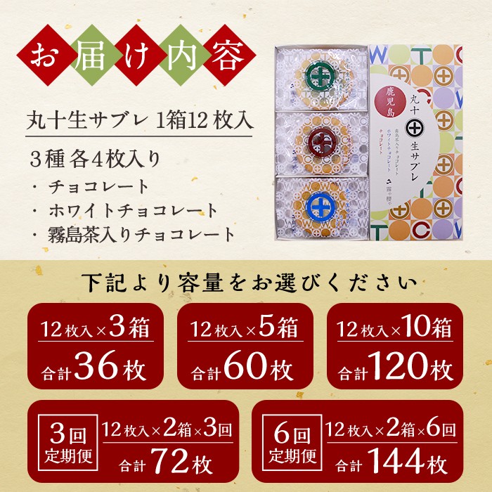 柔らかな食感とバターの香ばしい風味が融合したサブレ♪ C-086 《選べる容量・定期便》丸十生サブレ詰め合わせ(計36枚~最大144枚)【徳重製菓とらや】霧島市 生サブレ サブレ しっとり なめらか マイルド お菓子 焼菓子 おやつ お土産 贈り物 手土産 チョコレート ホワイトチョコレート 霧島茶チョコレート
