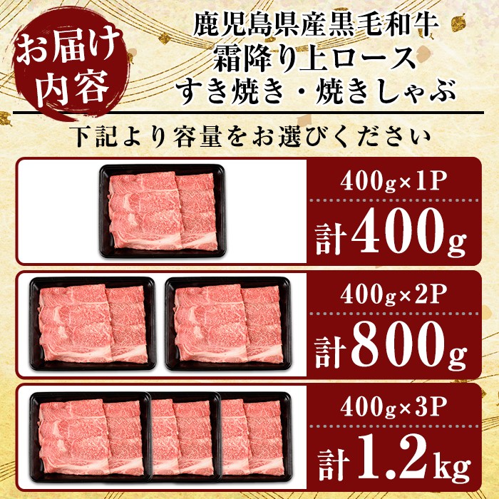 国産・鹿児島県産黒毛和牛!霜降りが特徴のリブローススライスをお届け K-320 <選べる容量>鹿児島県産黒毛和牛<A5等級>霜降り上ロースすき焼き・焼きしゃぶ(計400g~1.2kg)【ビーフ倉薗】霧島市 牛肉リブロース スキヤキ 国産 鹿児島県産 黒毛和牛 肉 精肉 牛
