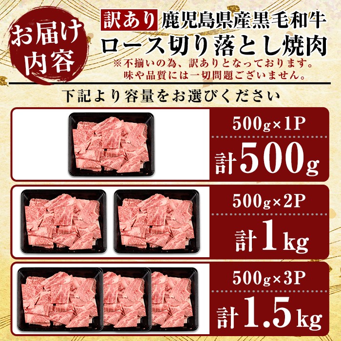地域の生産者応援の品 鹿児島県産黒毛和牛!サーロインやリブロース、肩ロースなど様々な部位を楽しめる K-321 <訳あり・不揃い> 選べる容量!鹿児島県産黒毛和牛<A5等級>ロース切り落とし焼肉(計500g~1.5kg)【ビーフ倉薗】霧島市 牛肉 ヤキニク 焼き肉 国産 鹿児島県産 黒毛和牛 肉 精肉 牛