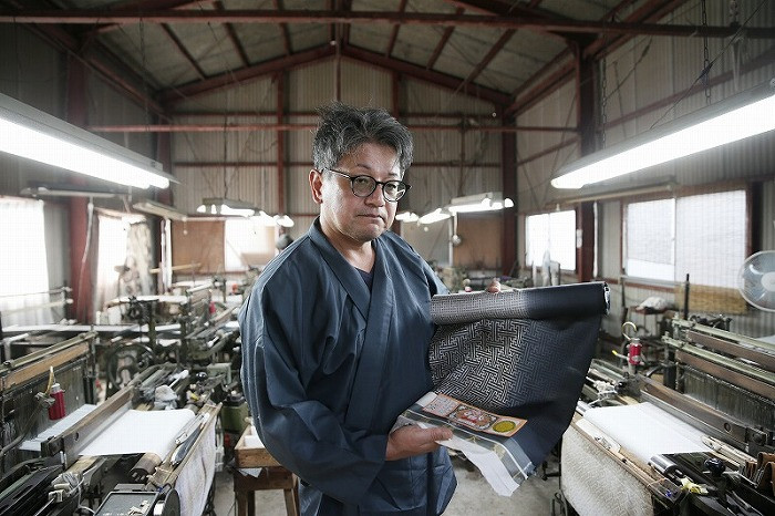 市内の工場において原材料仕入れを行い、機織機で大島紬の反物を制作。その反物生地を用い洋服を制作。