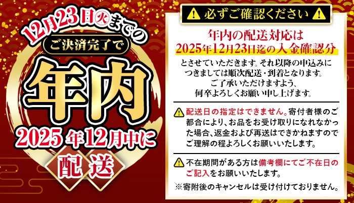 ※原則、ご入金確認後順次発送していきます。12月23日までにご入金完了の方には、年内までの到着が可能です。 ※12月24日以降にお申込みの方は、原則年明け発送で、ご入金確認後30日以内に順次発送します。 ※ご不在の日がありましたら、必ず備考にご記入ください。 |