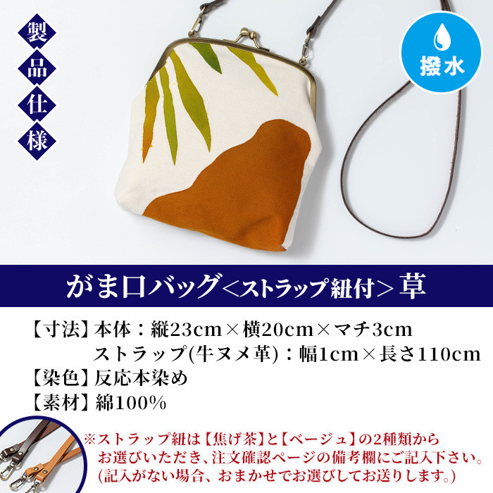 | 容量 | 【商品名】 ・がま口バッグ 【種類】 ・草 ※ストラップ紐は【焦げ茶】と【ベージュ】の2種類からお選びいただけます。 ご希望の紐柄を備考欄にご記入下さい。 記入がない場合は、おまかせでお選びしてお送りいたします。 【寸法】 ・本体:縦23cm×横20cm×マチ3cm ストラップ(牛ヌメ革):幅1cm×長さ110cm ※ストラップの長さは調節できませんのでご了承ください。 【加工】 ・反応本染め ※撥水加工しております。 ※すべて一点もののため画像と風合いが異なります。 【素材】 ・綿100% |