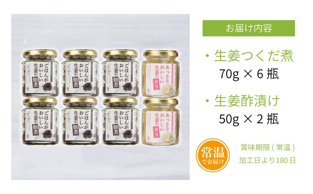 | 容量 | ・生姜佃煮 70g×6個 ・生姜酢漬け 50g×2個 |