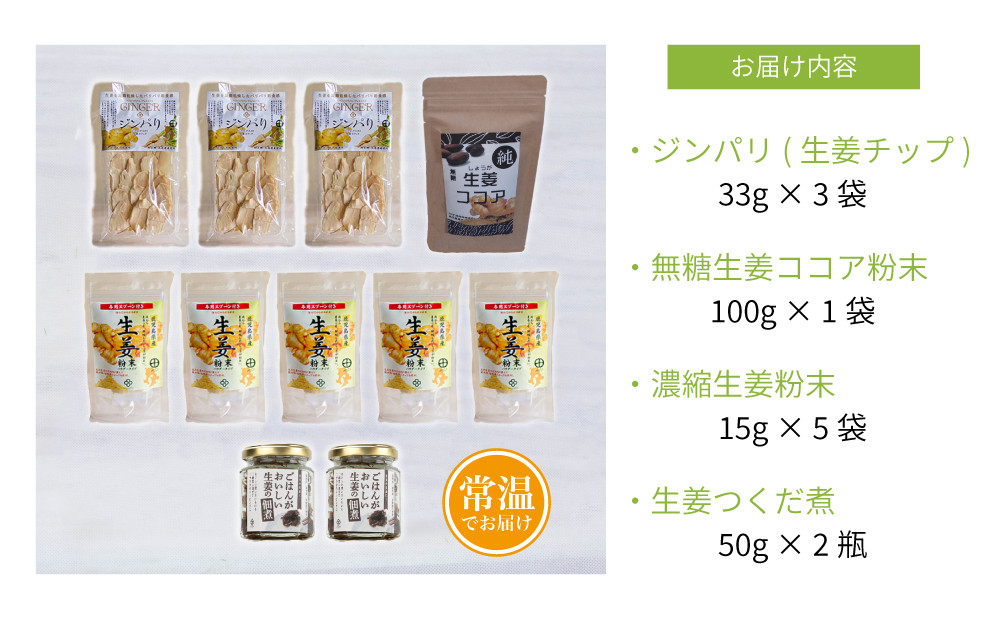 | 容量 | ・ジンパリ(生姜チップ) 33g×3袋 ・無糖生姜ココア粉末 100g×1袋 ・生姜粉末 15g×5袋 ・生姜つくだ煮 50g×2個 |