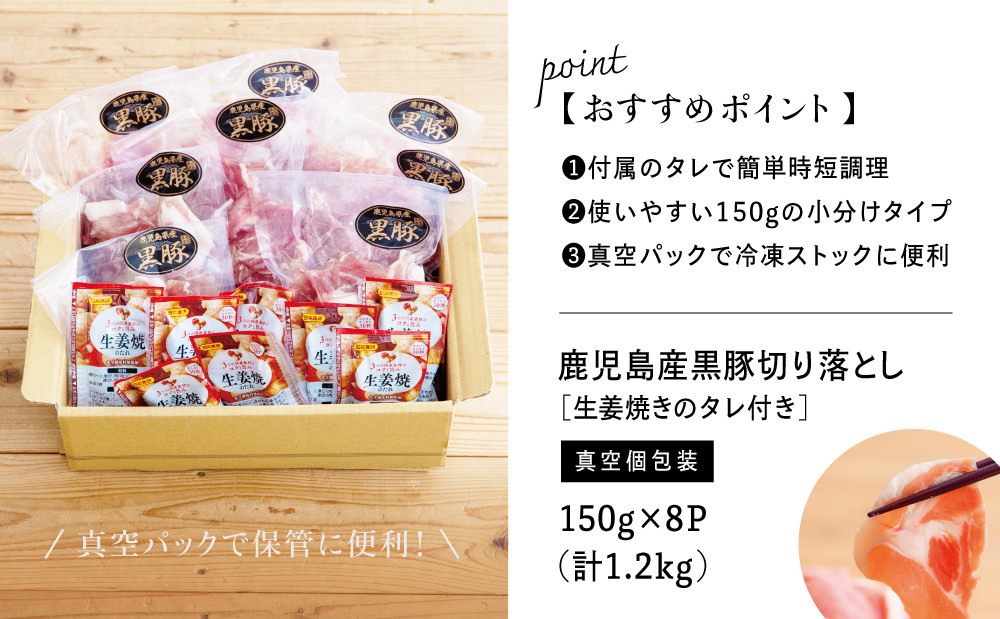 様々なお料理に使える鹿児島県産黒豚切落し。150gずつの小分け真空パックで便利! 鹿児島県産 黒豚切り落とし 計1.2kg(150g×8P)[生姜焼たれ付き] 小分けパック おうちごはん おかず しょうが焼き 簡単 お手軽 冷凍 お弁当 豚丼 国産 コワダヤ 南さつま市