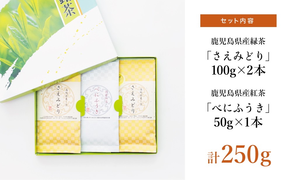 | 容量 | ・鹿児島県産緑茶「さえみどり」100g×2 ・鹿児島県産紅茶「べにふうき」50g×1 ※実際のお品とはパッケージのデザイン・仕様が一部異なる場合がございます。 |