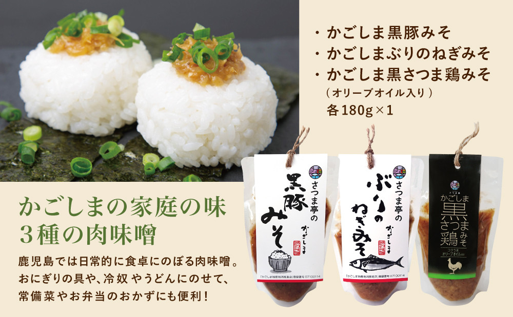 | 容量 | ・黒豚みそ 180g ・ぶりのねぎみそ 180g ・かごしま黒さつま鶏みそ(オリーブオイル入り) 180g |