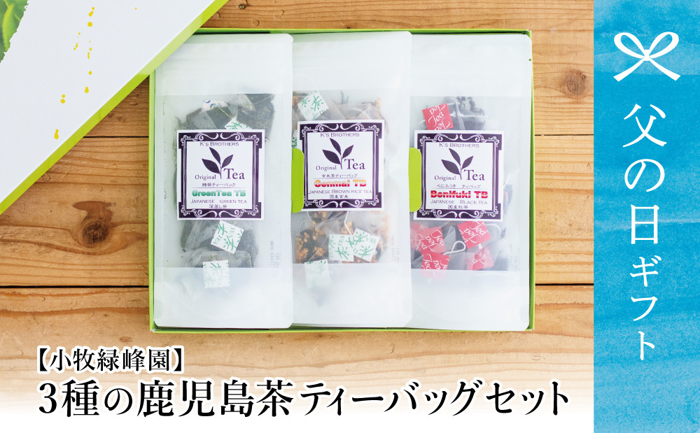 鹿児島県産茶葉を使用した、便利な3種のティーバッグセットです。 【父の日ギフト】小牧緑峰園 3種の鹿児島茶セット[緑茶・玄米茶・紅茶] 計60個(各10個×6袋) ティーバッグタイプ 鹿児島県産 かごしま お茶 日本茶 緑茶 紅茶 小分け 便利 飲み比べ 南さつま市 贈り物 ギフト 贈答用