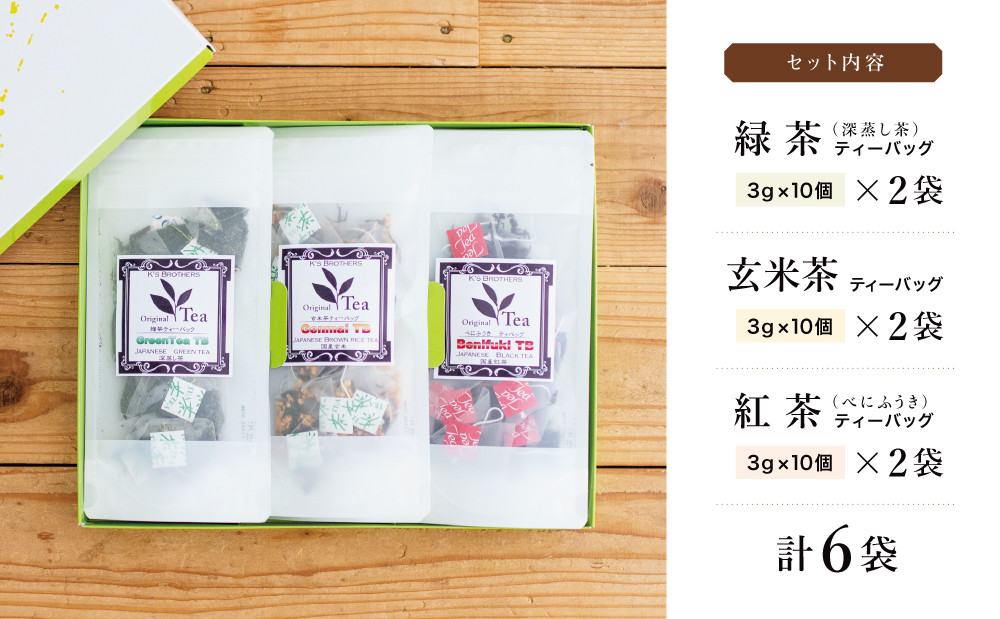| 容量 | ・緑茶ティーバッグ 2袋 (1袋あたり:3g×10個入) ・玄米茶ティーバッグ 2袋 (1袋あたり:3g×10個入) ・紅茶ティーバッグ 2袋 (1袋あたり:3g×10個入) 計6袋 |