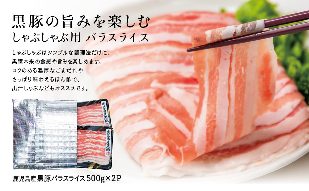 程よい甘みがある上質の脂、コクとうまみのある肉質の黒豚バラ肉をたっぷり1kg 【鹿児島県産】黒豚 バラスライス しゃぶしゃぶ用 計1kg (500g×2P) 国産 豚肉 国産豚肉 豚バラ お鍋 冷凍 スライス 小分け コワダヤ 南さつま市