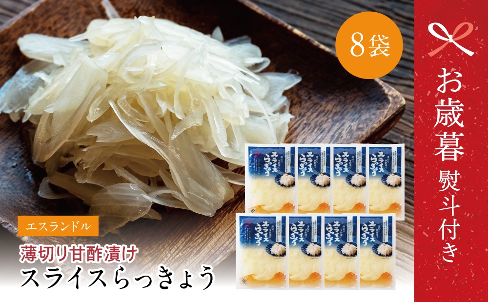 砂丘地で栽培された白宝らっきょうをオリジナル漬け液で味付けしスライスしました。 【お歳暮ギフト】【鹿児島県産】スライス白宝らっきょう 8袋 惣菜 らっきょう漬 らっきょう 漬物 甘酢 鹿児島 エスランドル 南さつま市 お歳暮 のし対応 熨斗