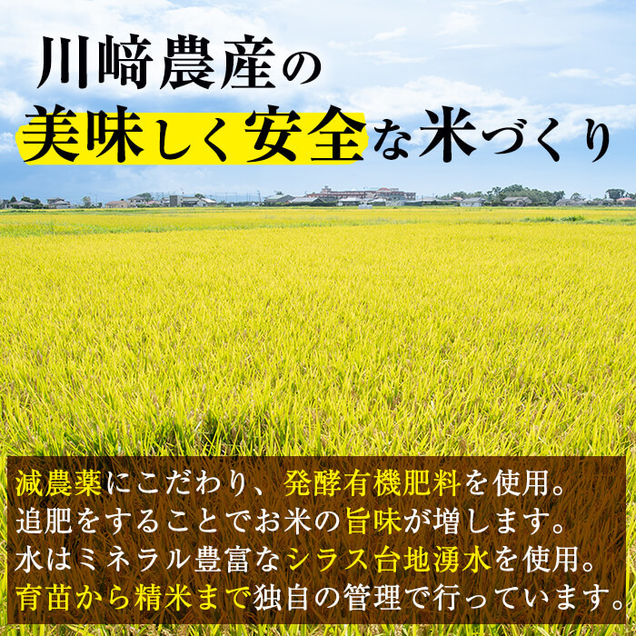 私たち川崎農産はシンプルに「美味しく安全な米づくり」だけを考えて米を作っております。だからこそ減農薬や害虫などの生態を勉強し、環境保全型の農業スタイルを築いてきました。一般の農家よりも手間隙はかかりますが、それだけ自分たちの作る米に自信があります。だからこそ、私たちは自作の米を、直接地域の方に食べていただき、毎年ダイレクトに評価受けることにしています。育苗から刈取りまで全てを私達独自の管理で行い、収穫後も大型の保冷庫管理を行っております。なお、発送直前に精米を行うため、より新鮮なお米をお届けすることにしております。今回はこれまでの取り組みが、口コミで広がり志布志市のふるさと納税の返礼品へ登録することとなりました。味には絶対の自信があります。ぜひ この機会にご賞味ください。
